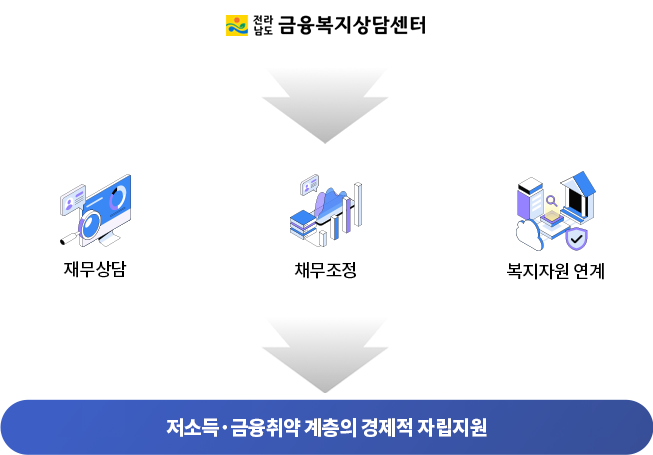 채무조정상담, 재무상담, 복지자원연계 등의 서비스를 제공하여 전라남도 도민의 경제적 자립과 회생을 지원하는 금융복지서비스 전문기관입니다.